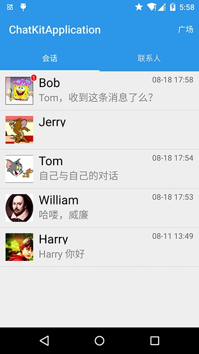 因为 ChatKit 是与应用的用户体系完全解耦的,所以 ChatKit 中并没有包含联系人列表页面,但部分开发者可能有此需求,所以 chatkitapplication 实现了一个基于 LCChatProfileProvider 的联系人列表页面,具体代码可以参考 ContactFragment.java, 具体效果如下:
